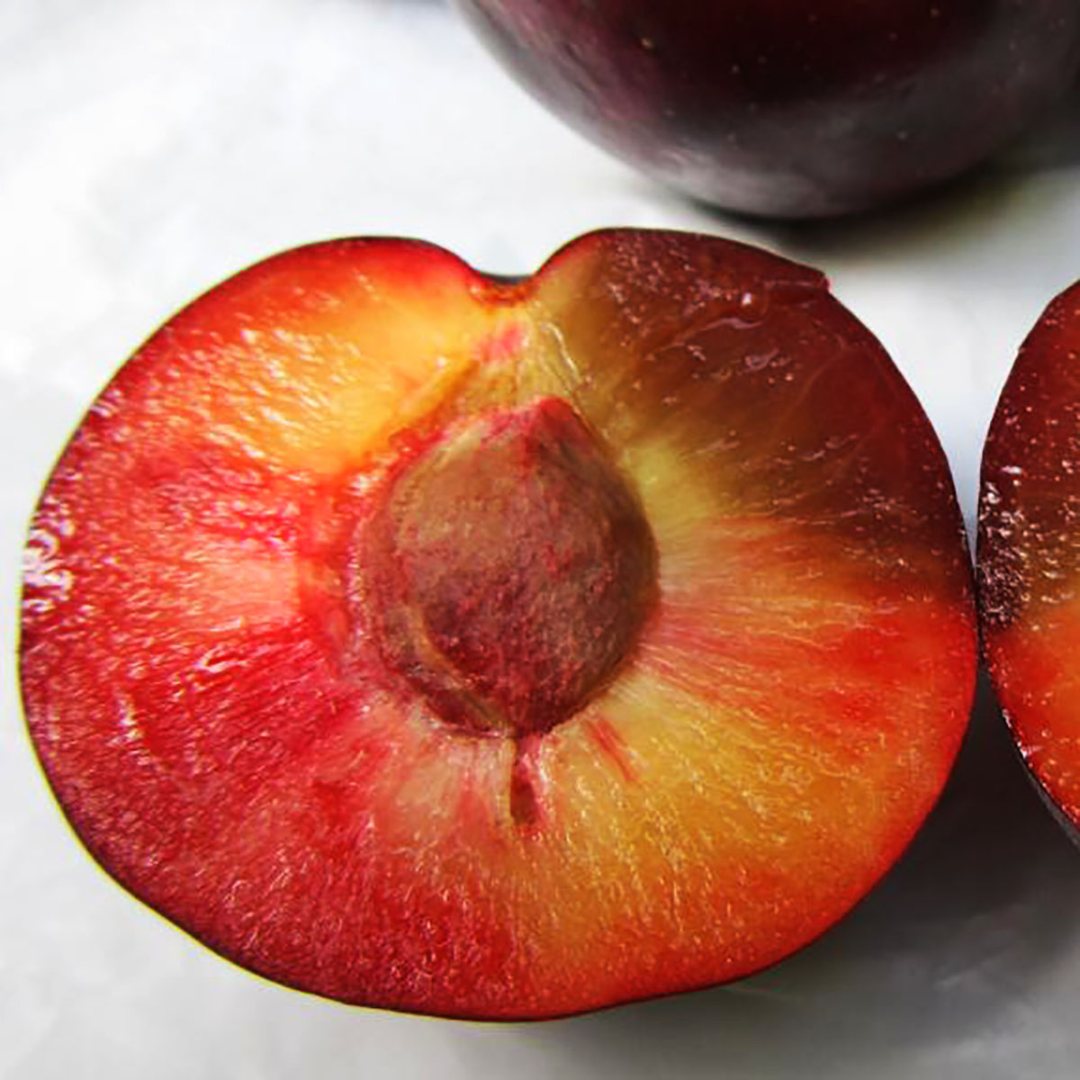 ПЛОДИ: великі 50-95 г, круглі. При великій кількості плодів вони менші, але все одно досягають ваги 50-60 г. Шкірка плода червоно-фіолетова з численними білими точками та восковим нальотом середньої густоти. М’якоть червона-бурякова, щільна, солодка з невеликою кислинкою, смачна (4,7б) з легким присмаком абрикосу. Кісточка невелика, відділяється. Плоди транспортабельні, гарно підходять для споживання у свіжому вигляді та різних видів консервів (соки з м’якоттю, компоти, варення). Врожайність висока.