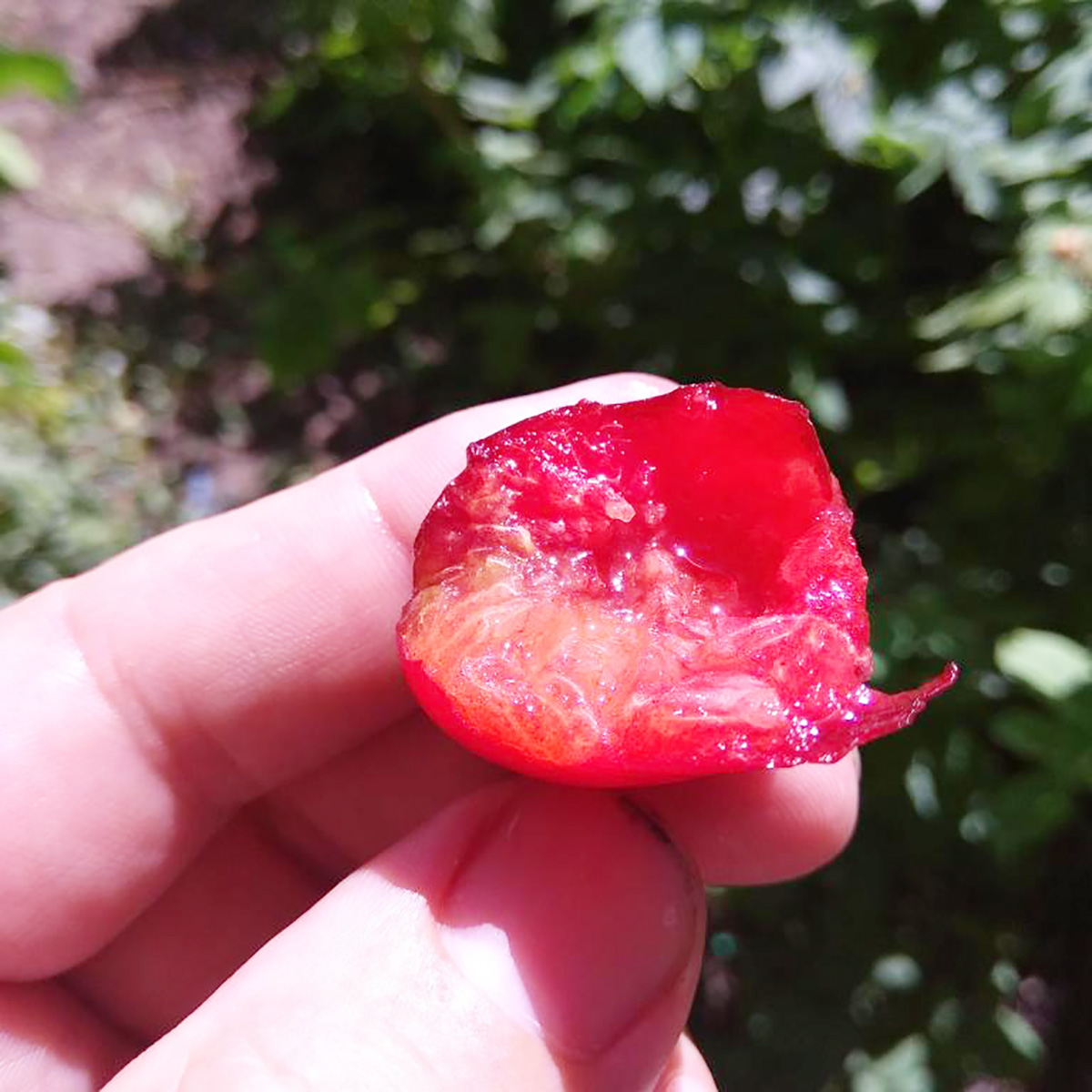 ПЛОДИ: Невеликі 25-45 г, круглі або широкоовальні. Шкірка середньої щільності і товщини, жовтовато-червона, з бордовим рум’янцем і дрібними світлими плямами, у слабкому восковому нальоті. М’якоть жовтовато-кремова, ніжна, дуже соковита, тануча, ніжно-волокниста, густа, під шкіркою малиново-червона, з легким ароматом, солодко-кисла (4,0 бали).
