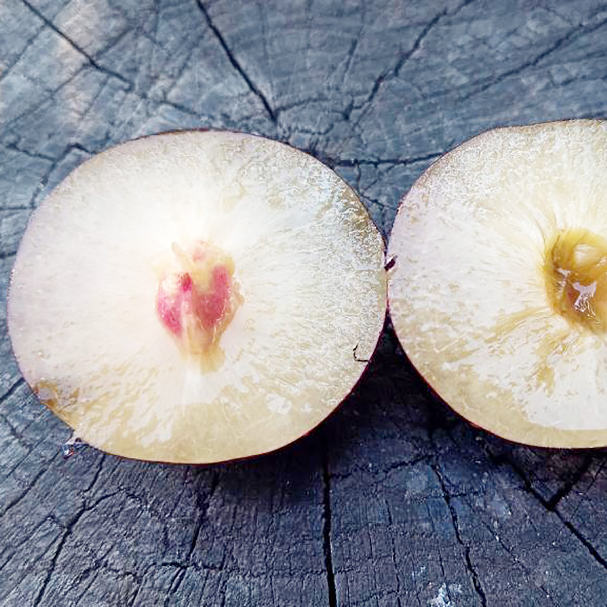 ПЛОДИ: дуже великі 70-150 г, круглої форми. М’якоть жовто-рожевого кольору, соковита, щільна, хрящовата, ароматна, присутні нотки дюшеса. Сорт має високі смакові якості.
