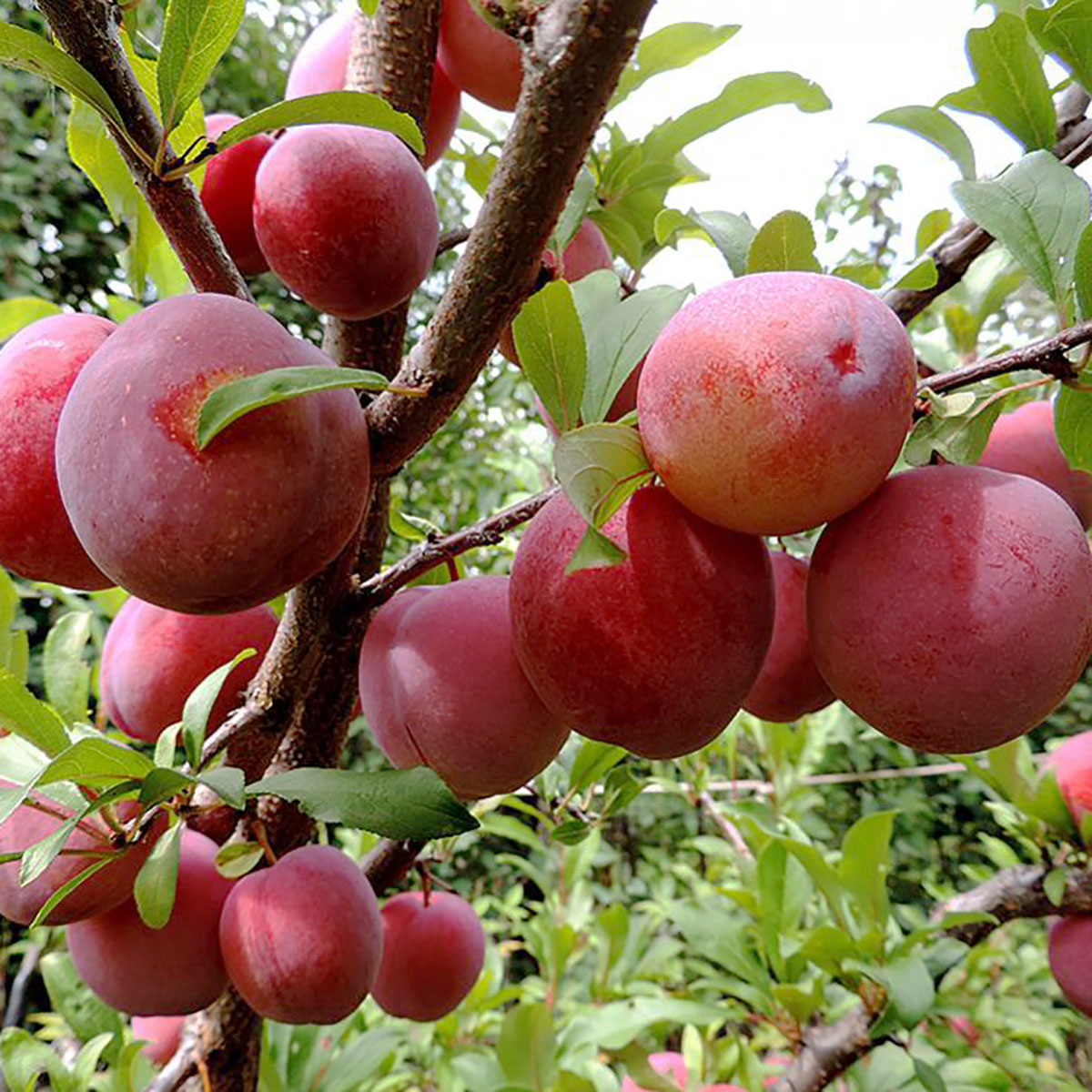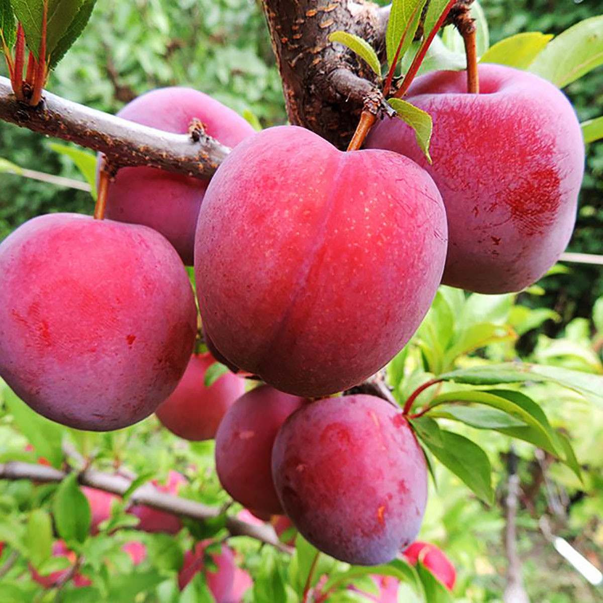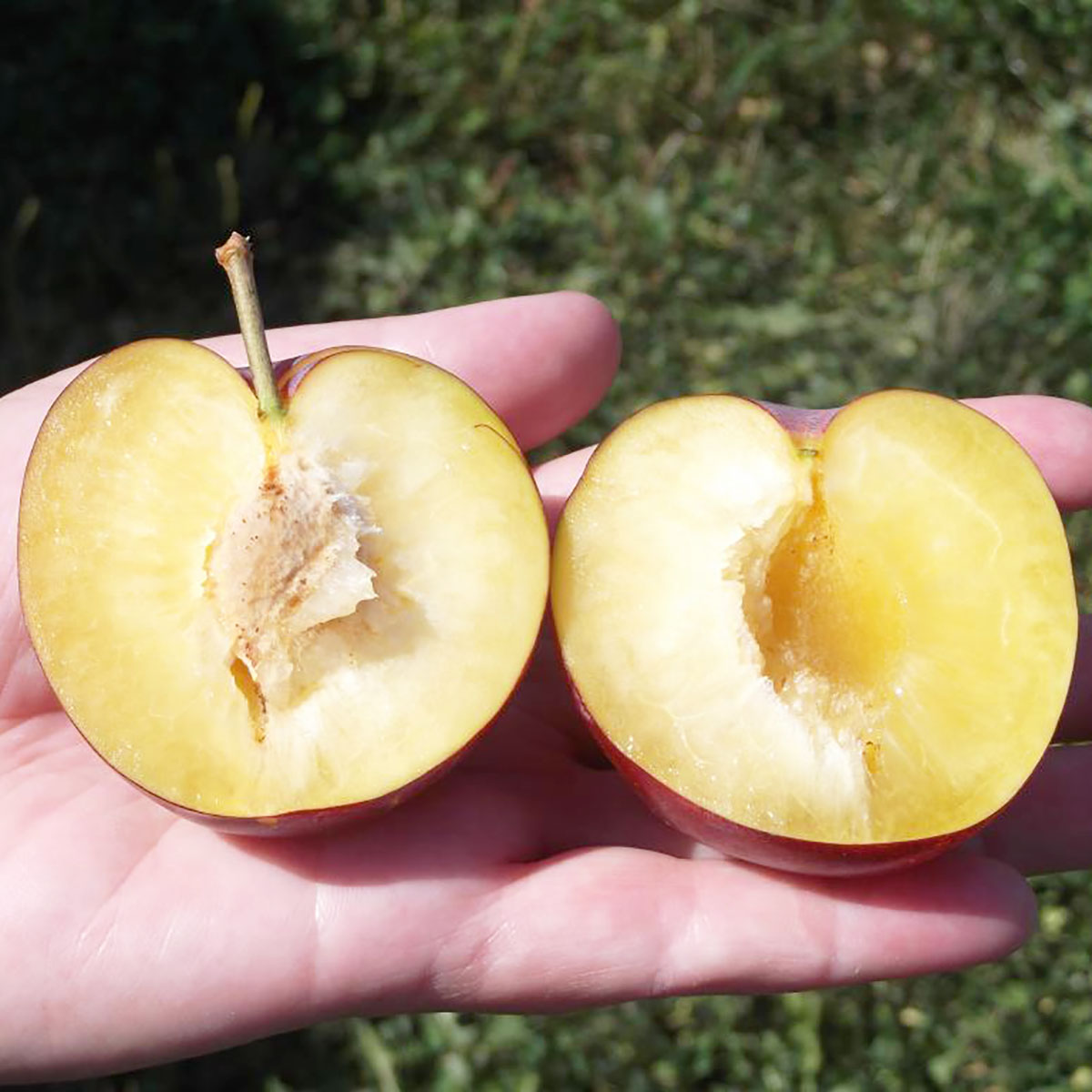 ПЛОДИ: дуже великі 70-100 г, окремі плоди до 150 г. Форма широко-овальна, темно-бордового забарвлення, покриті пруїновим нальотом, покриті світло-сірими плямами, гладкі. М’якоть дуже солодка, ніжна, соковита, досить щільної консистенції, дуже ароматна. Смакові якості дуже високі, смак дуже добре збалансований, після споживання відчувається приємний післясмак, що нагадує одночасно декілька фруктів – абрикос, слива і алича. Кісточка маленька і добре відокремлюється.