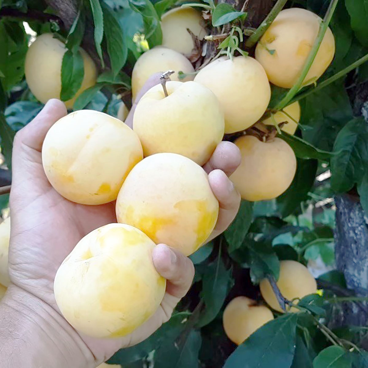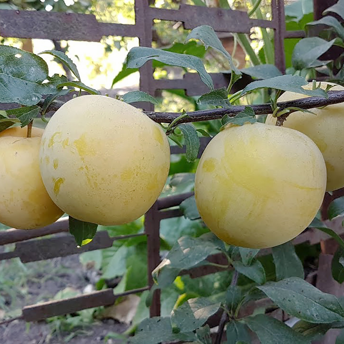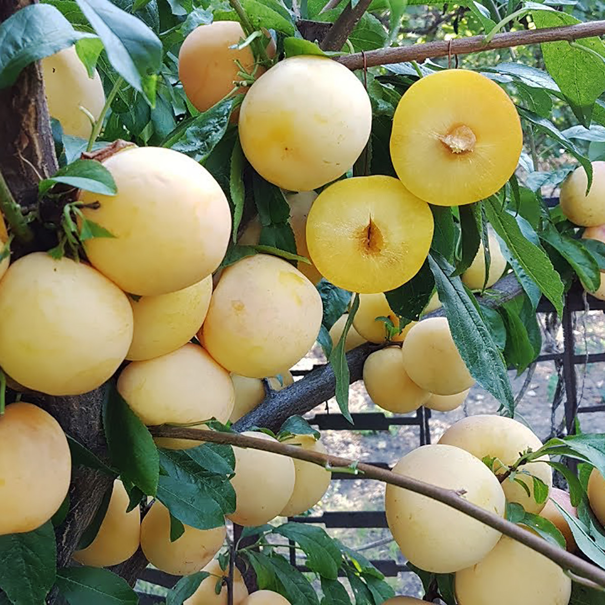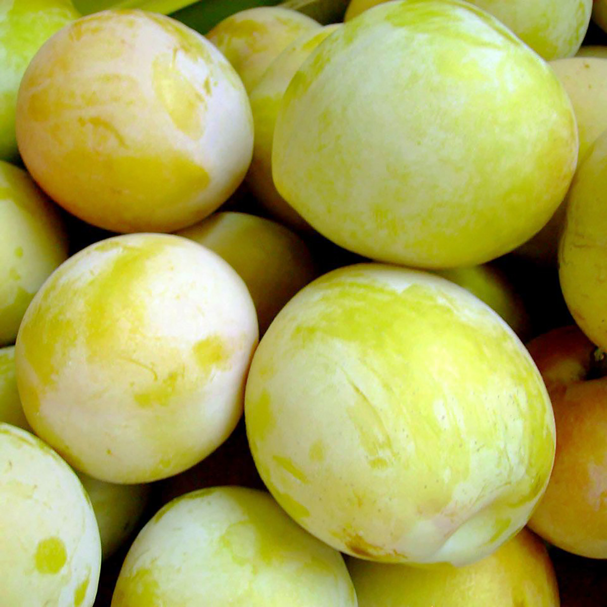 ПЛОДИ: дуже великі, масою 100-150 грам, круглої форми, трохи здавлені, світло-жовтого кольору з поверхнею, покритою пруїновим нальотом. М’якоть жовта, щільна, дуже соковита, ніжна, ароматна, солодка, з легкою кислинкою, відмінних смакових якостей, гарний баланс цукру і кислоти. Кісточка маленька, від м’якоті повністю не відділяється. За смаковими якостями перевершує деякі інші популярні сливи. Завдяки твердій текстурі плоди стійкі до розтріскування і можуть зберігатися тривалий час (близько 30 днів).