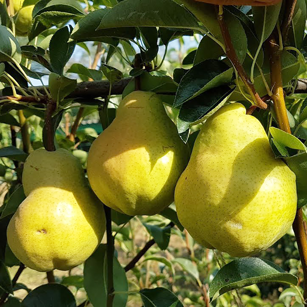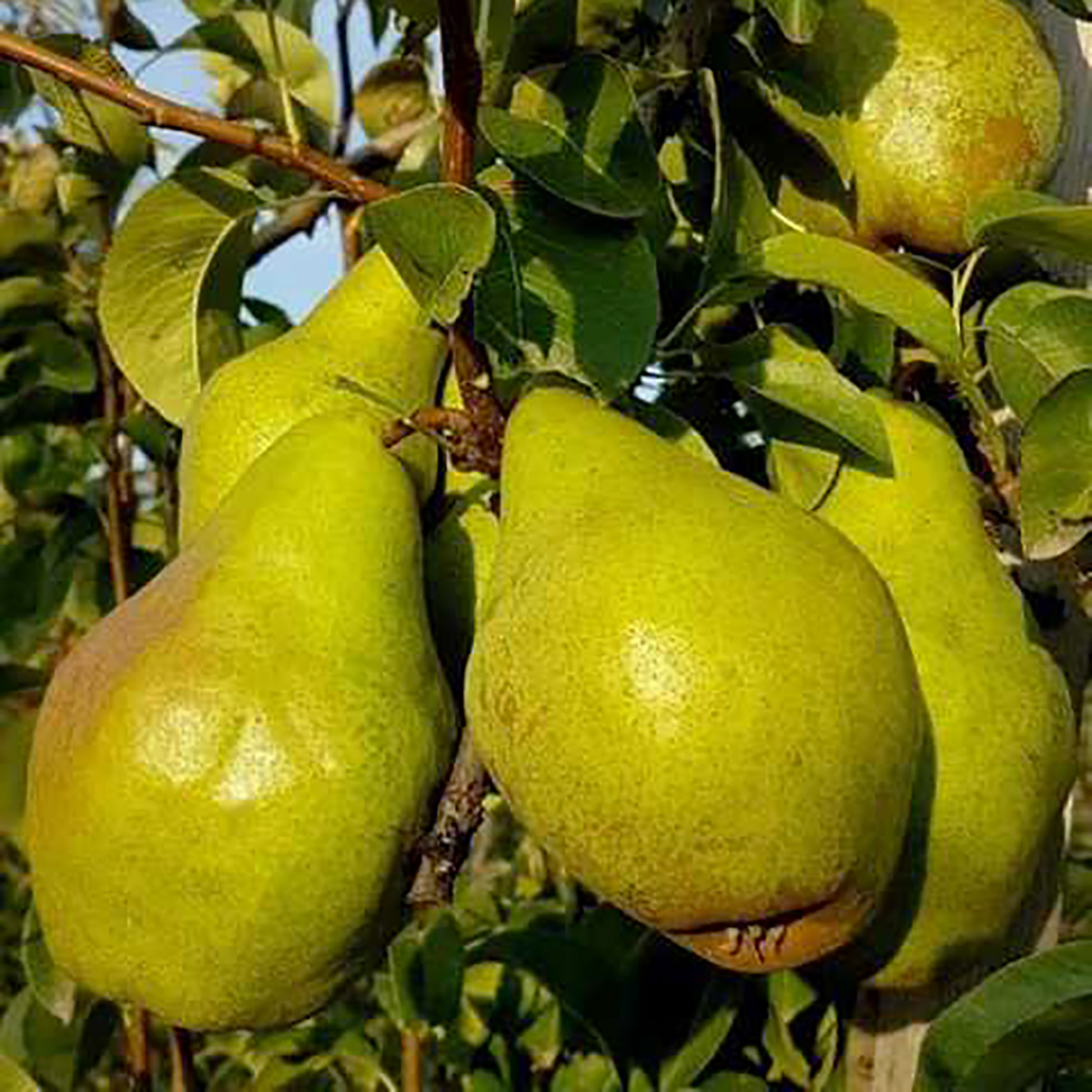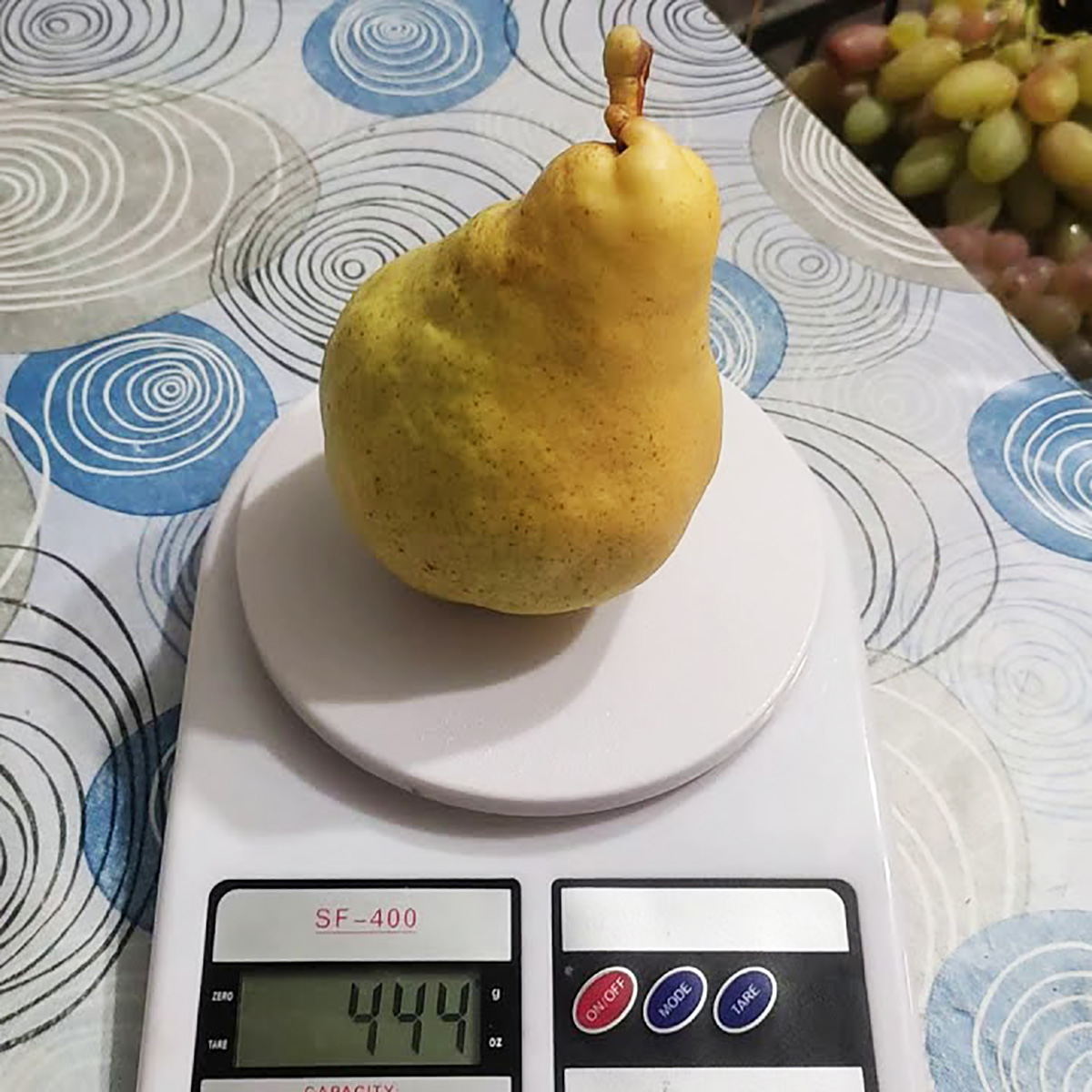 ПЛОДИ: витягнуті, широко-грушевидні, дуже великі, середня маса – 280-350 г, окремі можуть досягати 800 г, зеленувато-жовті з красивою блідо-рожевою рум’янцем на половині поверхні плоду. М’якоть щільна, масляниста, тануча, ніжна, без зернистості, соковита, солодка, ароматна, відмінного смаку.