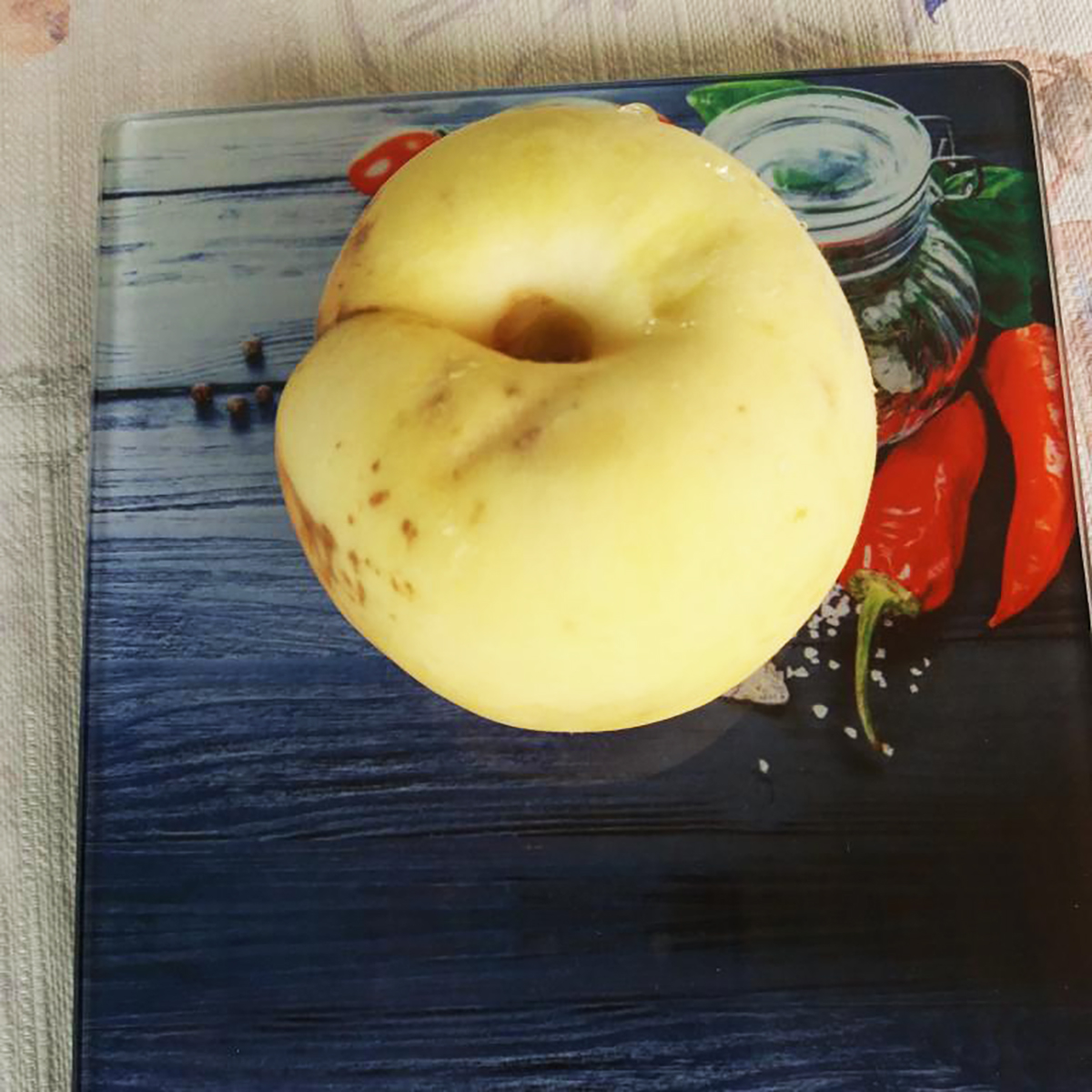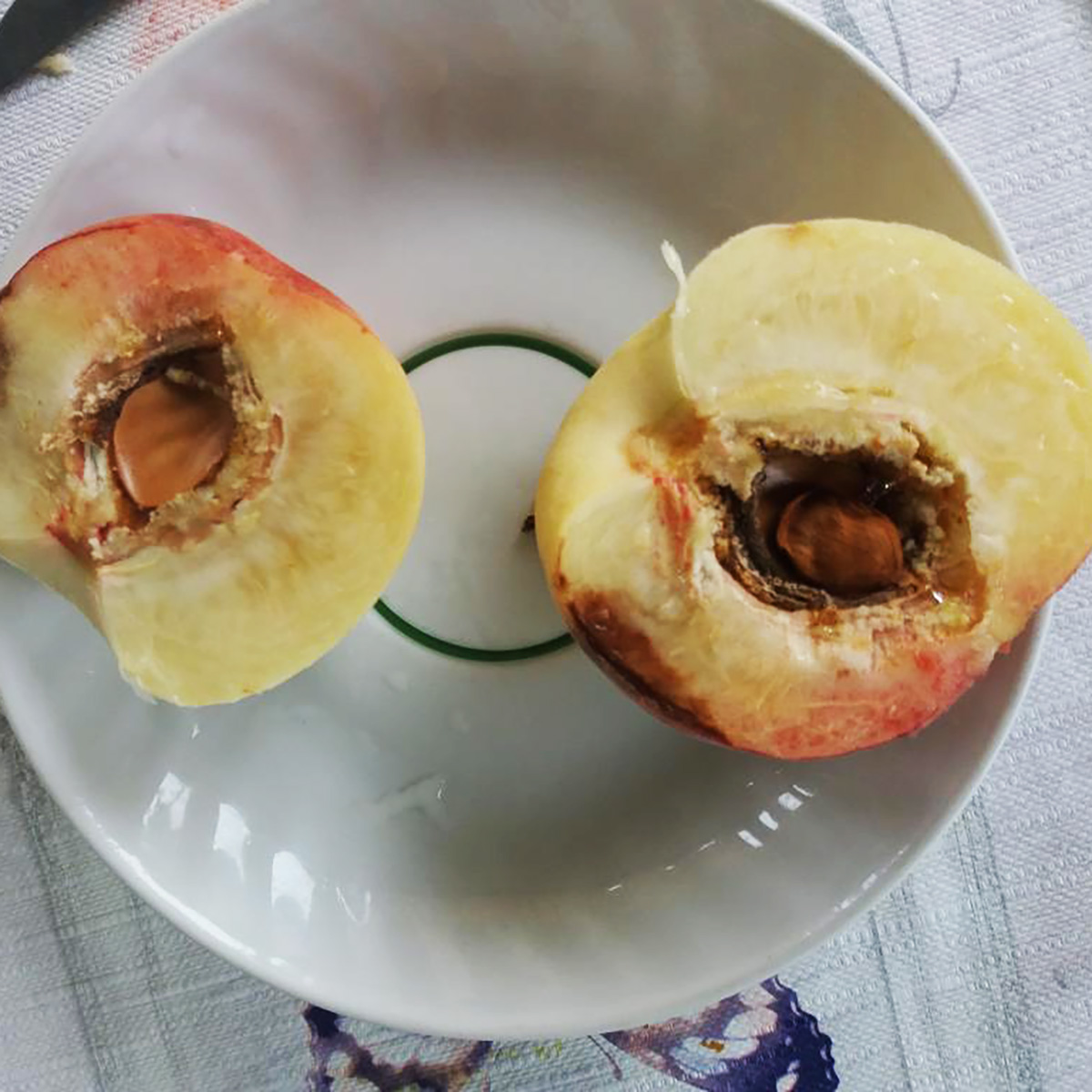 ПЛОДИ: Середні за розміром, вагою 70-140 г, кругло-овальні або круглі з неглибоким животиком. Опушення слабке, колір сніжно-білий, на добре освітлених плодах є красивий темно-червоний рум’янець. М’якоть біла, напівпрозора, соковита, ніжна, з високими смаковими якостями. Володіє гармонійним поєднанням цукру і кислоти. Дегустаційна оцінка 4,2-4,4 бала. Кісточка не відділяється від м’якоті.