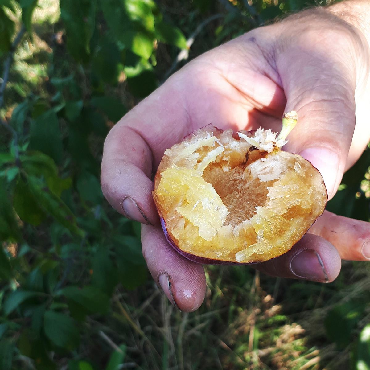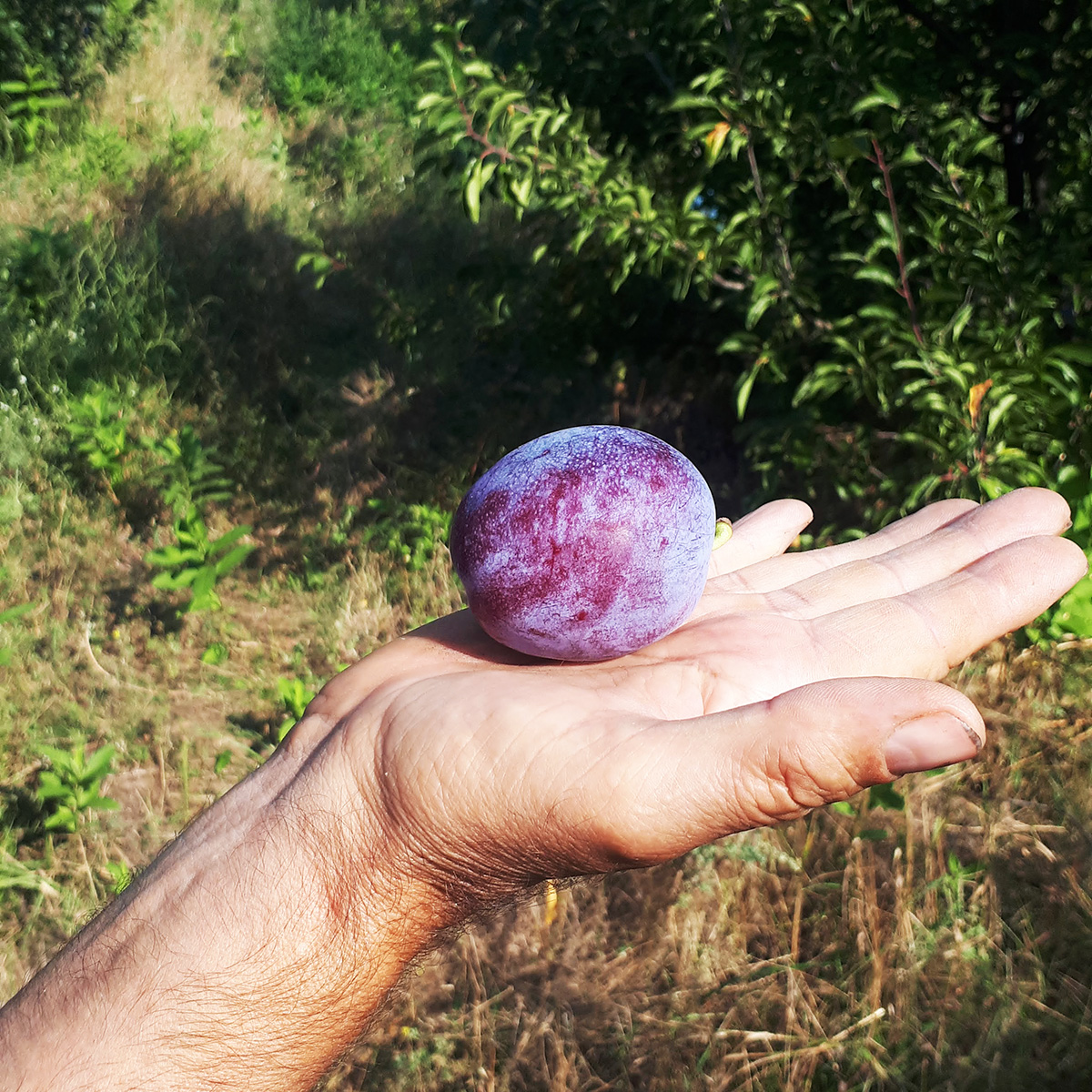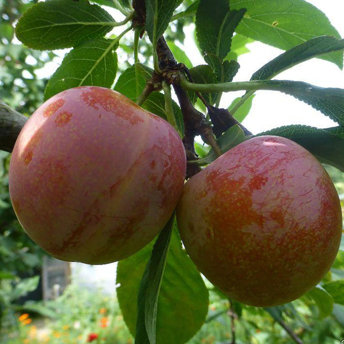 ПЛОДИ: великі, до 90 г, кулястої форми, фіолетово-синього кольору з пруїновим налетом, трохи шорсткі через багато малих точок під тонкою шкірою. М’якоть соковита, приємного солодкого смаку, золотисто-жовтого кольору, яка не відокремлюється повністю від кісточки. Врожайність з дорослої рослини приблизно 40-60 кг.